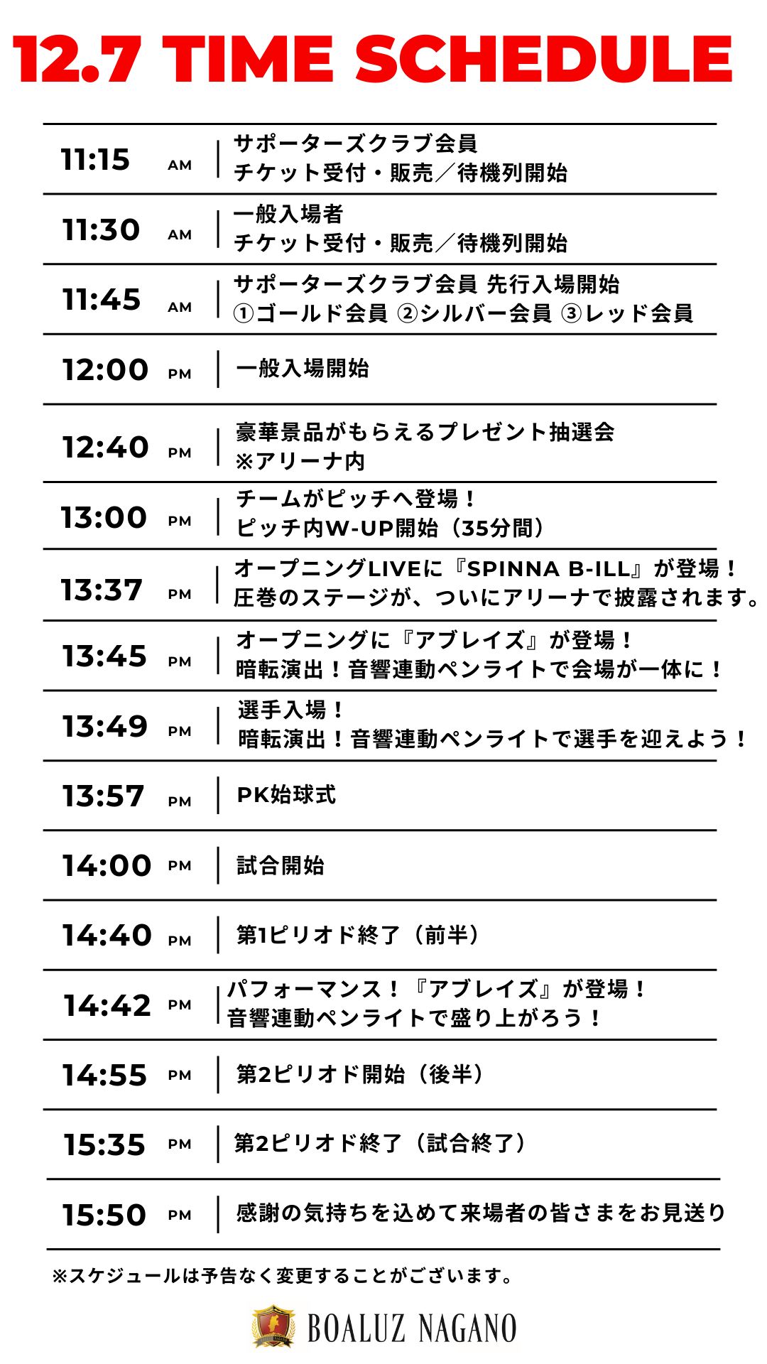 ボアルース長野では「持続可能な環境目標、SDGs」の一環として紙のプログラム配布を廃止し、WEB配信にて公開いたします。お手持ちのスマートフォン、タブレット、PCでぜひご覧ください。ホームページ試合情報、各種SNSからアカウント検索・フォローをしていただければご覧いただけます。何卒ご理解・ご協力をよろしくお願いたします。