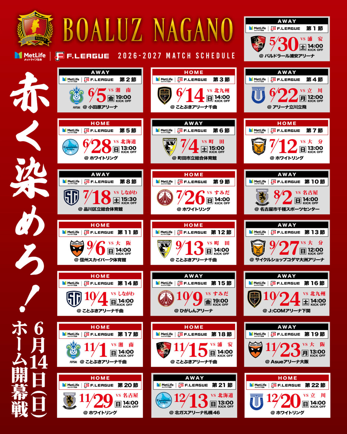 本日、Fリーグより発表されました通り、「メットライフ生命Fリーグ2026-27 ディビジョン1」の試合日程が決定しました。